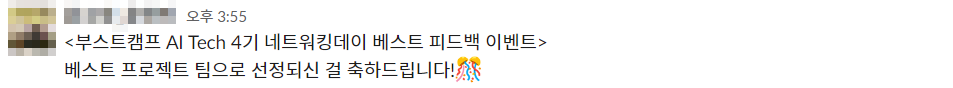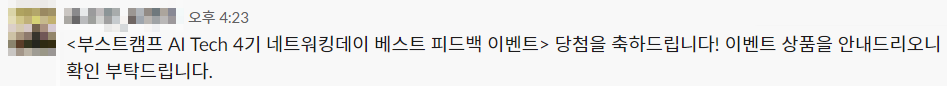 Boostcamp AI Tech를 만약 참여하게 된다면, 여러 활동들을 적극적으로 참여해 보는 것을 추천합니다. 뿌듯함을 느끼는 것은 물론, 소소한 보상이 기다릴 수도 있습니다.